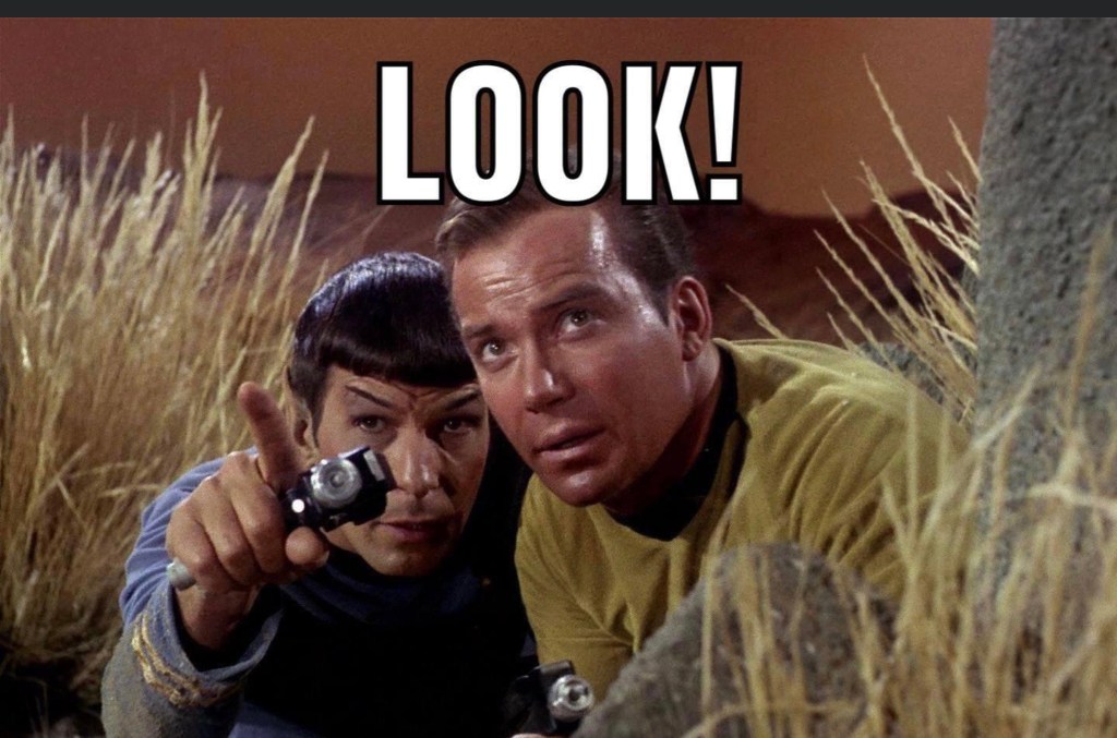Today, TFS and I combine our superior intellects (NOT!) to play our own version of Mad Libs. This is how it works. Spock (TFS) and Kirk (Hitchhiker) are looking at something with great excitement. Spock exclaims: “LOOK!………………………………………….”