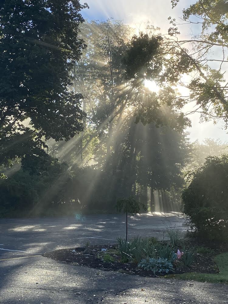 “J” took this picture a few mornings ago. It rained buckets the night before, and there was mist in the air as Sol came up in the east. As the rays broke through the branches, the mist created this cool effect.