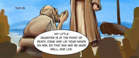 When Jesus had crossed again in the boat to the other side, a great crowd gathered around him; and he was by the sea. Then one of the leaders of the synagogue named Jairus came and, when he saw him, fell at his feet and begged him repeatedly, “My little daughter is at the point of death. Come and lay your hands on her, so that she may be made well, and live.” So he went with him. Mark 5:21-24a