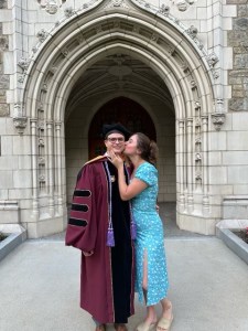HitchHiker share picture of Schmooze and Dr. Baby at his graduation. Schmooze earn doctorate in nursing practice (DNP). Schmooze now doctor! HitchHiker very proud of son-in-law.