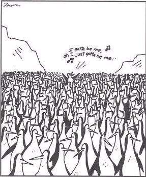 In the end, I am a disciple of Jesus Christ. And like the Gary Larson cartoon, there is a sea of penguins, and I’m the penguin standing in the middle singing, “I gotta be me!“