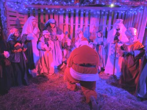 On Saturday, I did the gig at the library, and some kids seemed so comfortable with me. Then, that evening, Santa showed up at the church’s live nativity. He strolled up to the manger, dropped to a knee, lowered his head, eyes closed, and hands out as he paid homage to the Lord and King of Love-Mischief for about three minutes. Then he rose, turned around, and headed off into the evening. He didn’t say a word, but the message was clear…