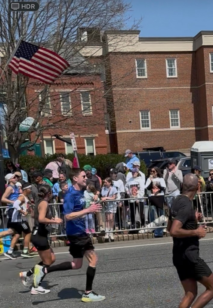 It was Patriot’s Day in Massachusetts, and “J”, Baby, the Schmooze, Mayhem!!, and I found ourselves standing on the sidewalk cheering people on in the Boston Marathon. We were in Natick, which is at mile eight of the twenty-six mile marathon.